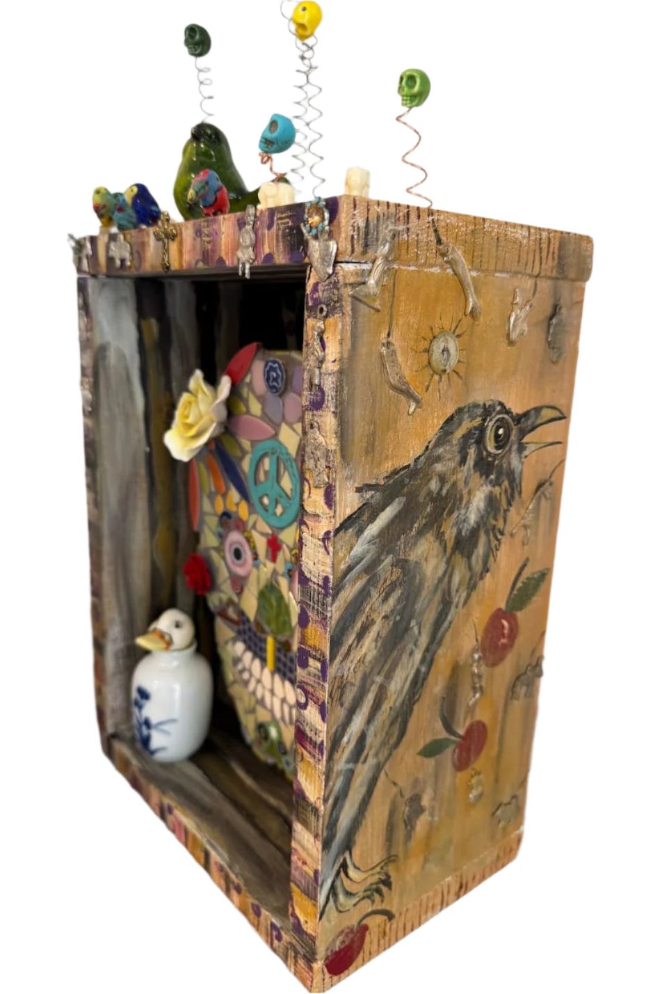 Each piece is made by hand, not mass-produced, and reflects a mix of bohemian flair, folk-art traditions, and modern edge. The custom-painted shadow box adds depth and dimension, making it ready to hang or display on a shelf.