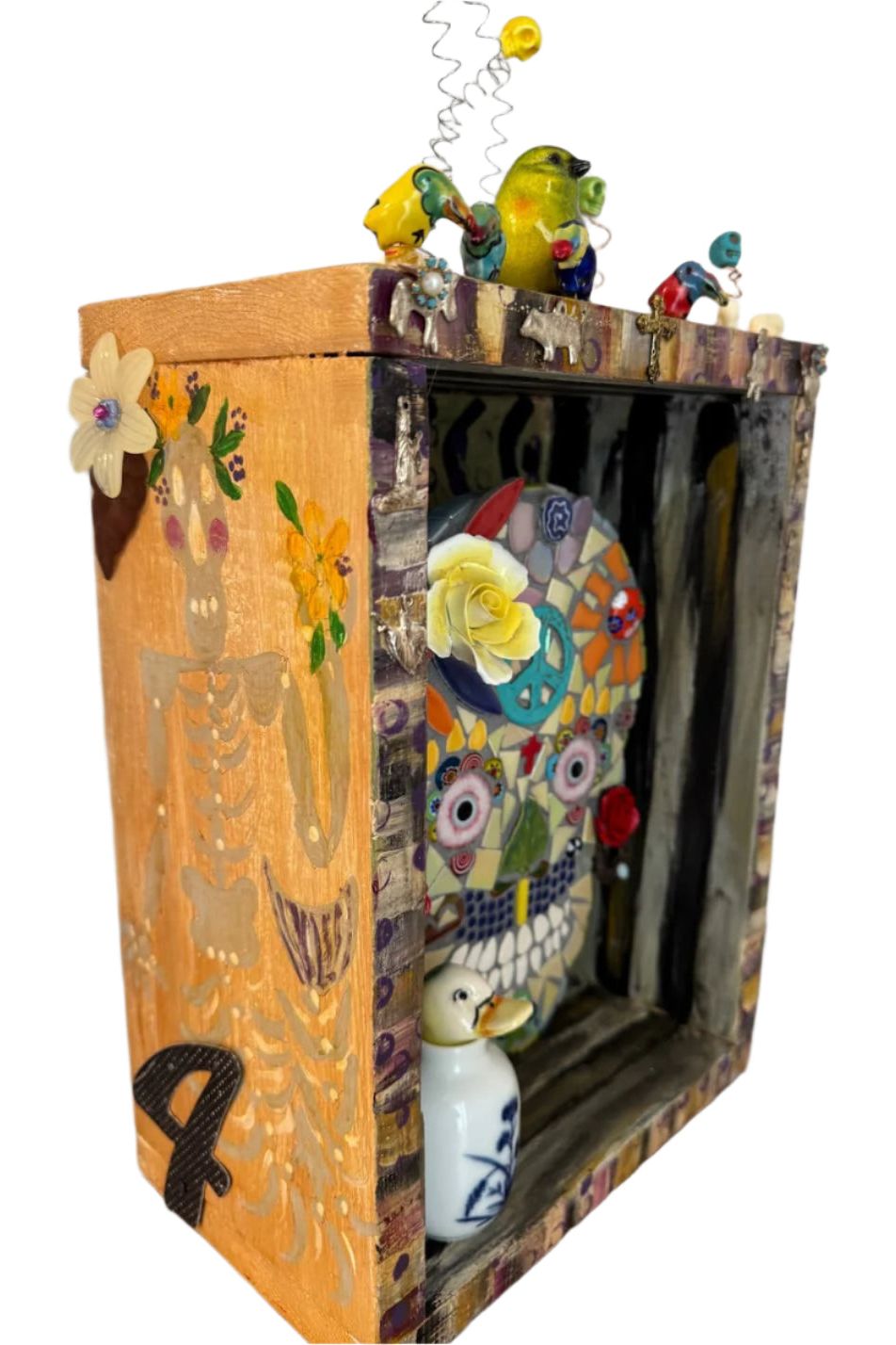 “Flower & Peace Skull” Mosaic – Handmade Art in Hand-Painted Shadow Box