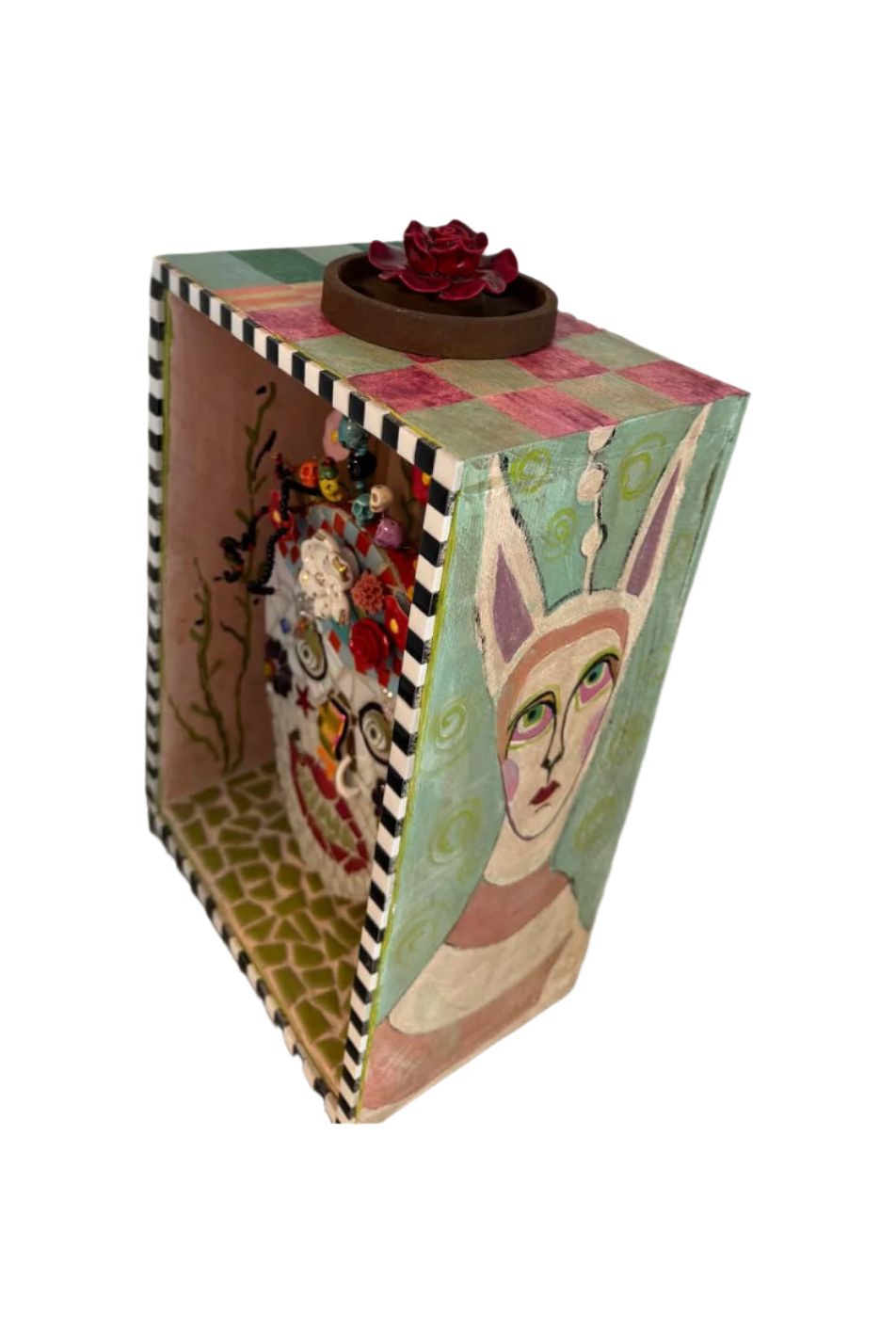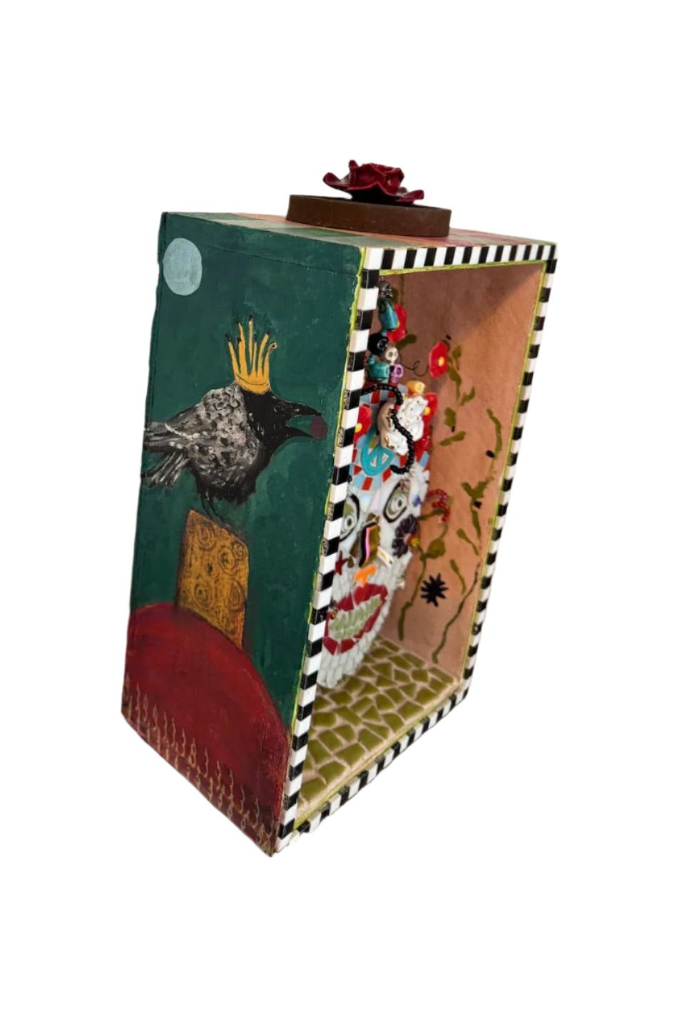 Each piece is made by hand, not mass-produced, and reflects a mix of bohemian flair, folk-art traditions, and modern edge. The custom-painted shadow box adds depth and dimension, making it ready to hang or display on a shelf.