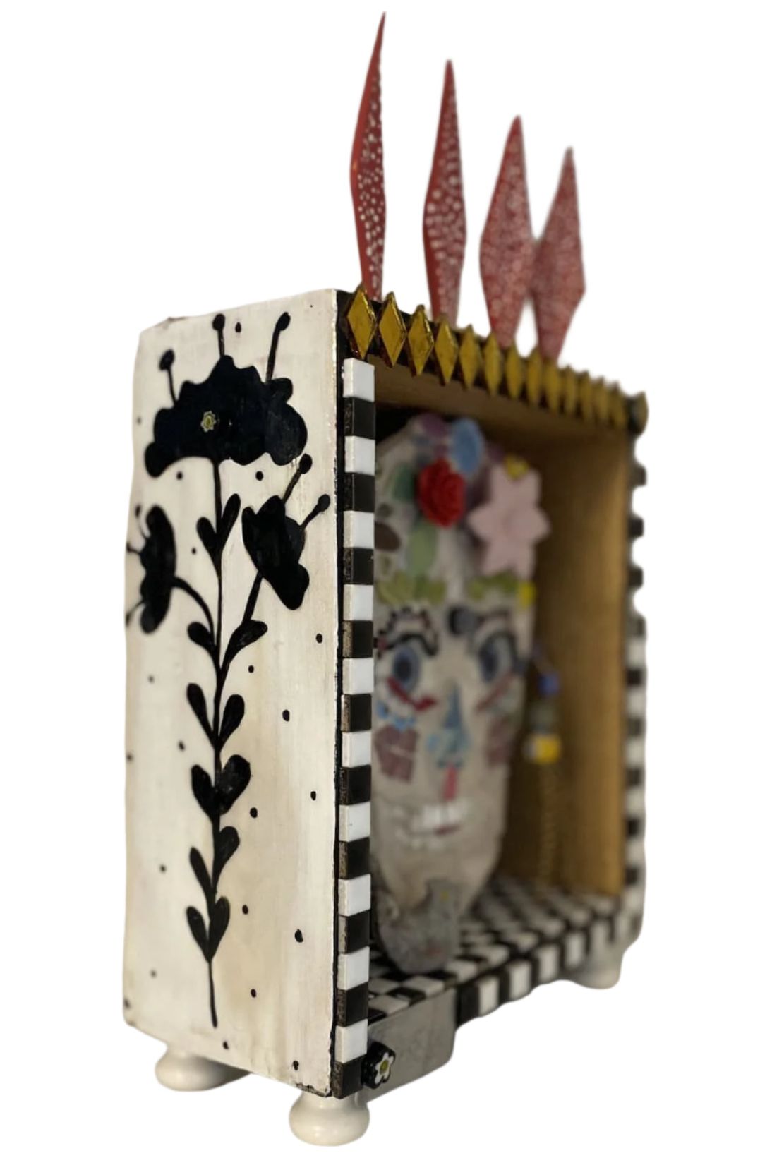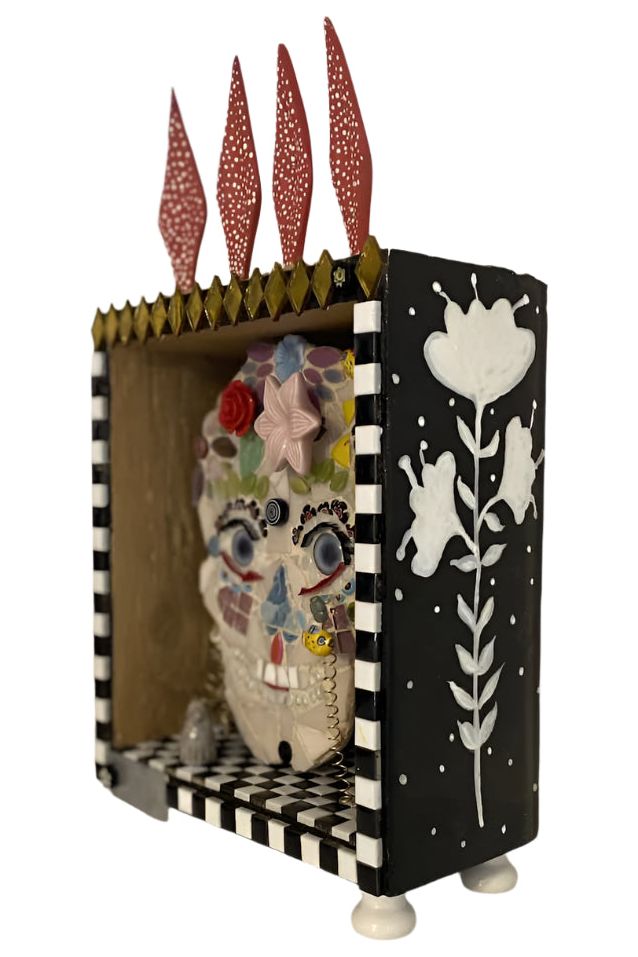 Multi Media mosaic with a sweet skull in handpainted shadow box. Cut glass and tile with ceramic feet.
